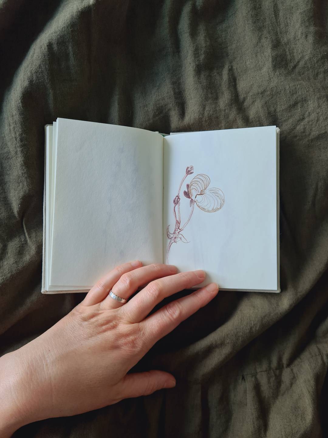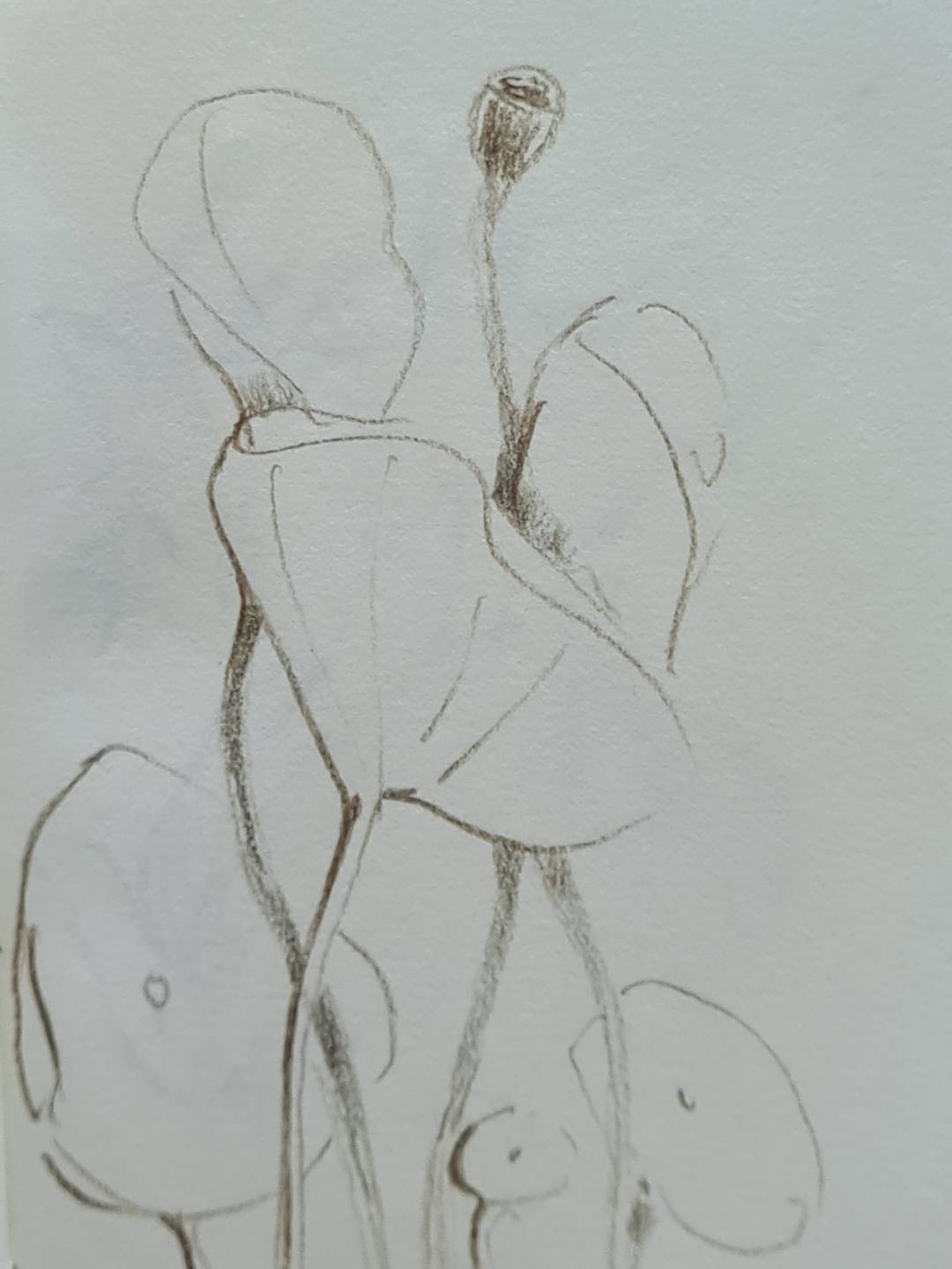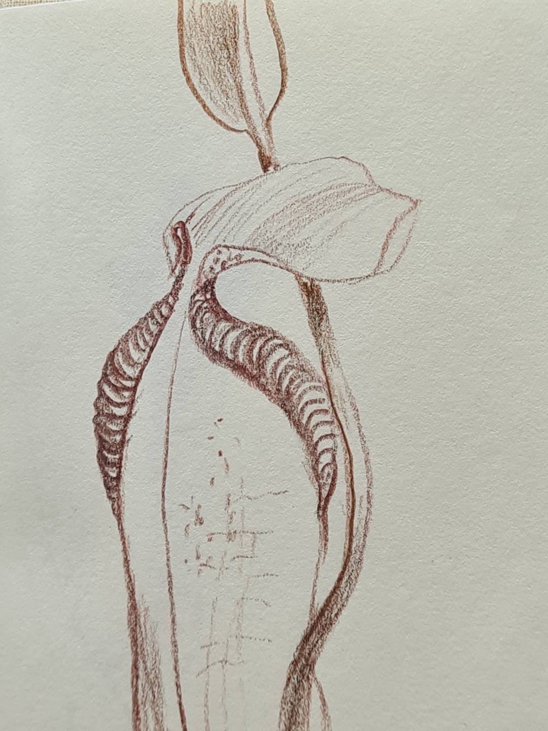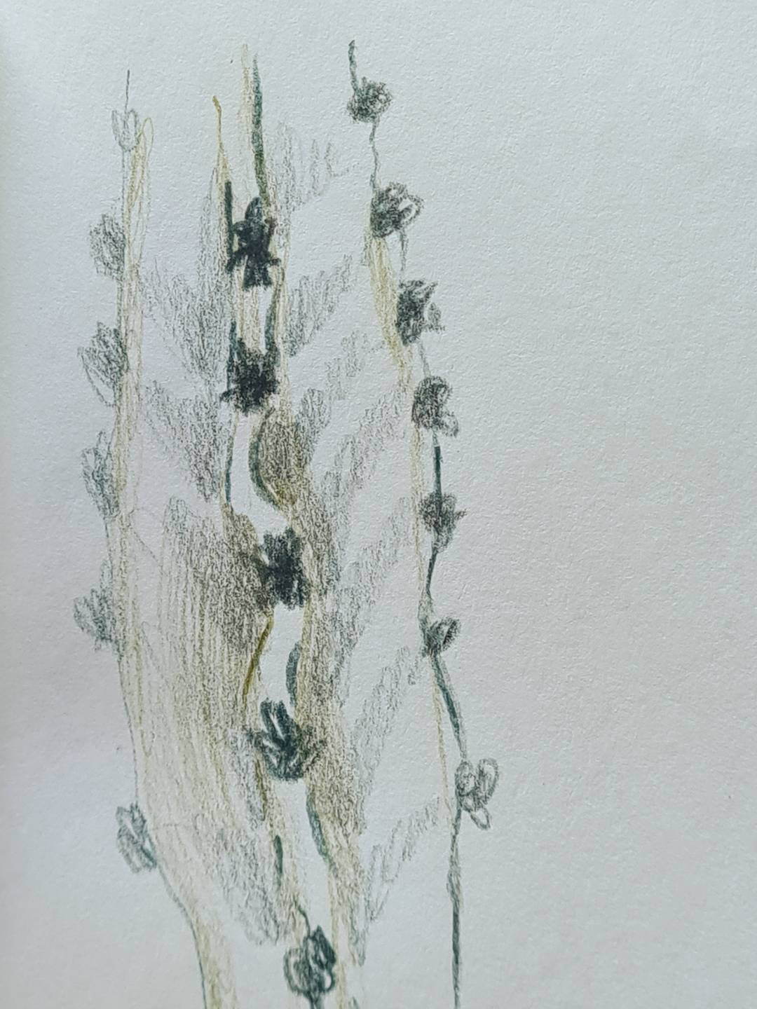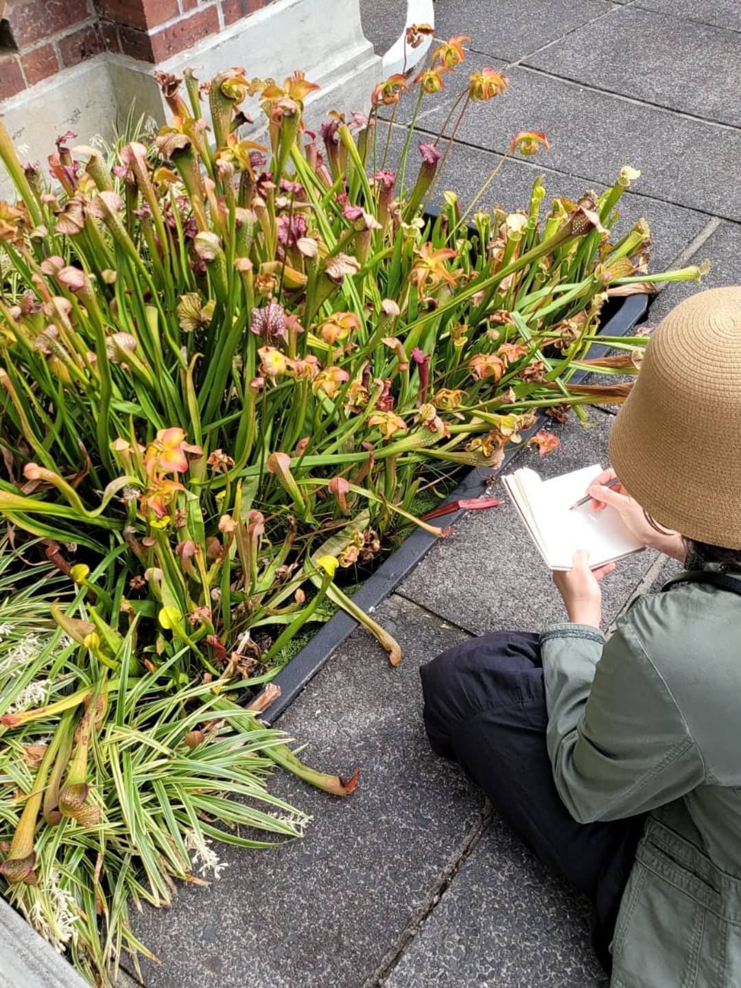 Me gusta visitar jardines y siempre que puedo saco fotos. Uso luego esas imágenes como inspiración. No copio las flores tal cual, de hecho la mayoría de las veces no sé qué tipo de planta es ni su nombre. Me interesan sus particularidades, como por ejemplo la forma de una hoja, su textura, la manera en que un pétalo se enrolla o las nervaduras que la recorren, sus manchas, sus abultamientos, la topografía de los tallos. A partir de eso detalles construyo mis propias plantas imaginarias. En una visita relámpago a un jardín que he registrado a través de los años con distintos tipos de cámara fotográfica, intuí que no tenía sentido volver a fotografiarlo. Lo que sentí fueron ganas de dibujarlo, de mirar cada espécimen vegetal con tal detenimiento que fuera como observarlo por primera vez. Tampoco me interesaba ir cargada y tenía poco tiempo para quedarme, así que llevé una caja de lápices de grafito coloreado Derwent Graphitinty un cuadernito hermoso que me regaló hace algunos años mi amiga Coy. Fue interesante percibir cómo mi mirada cambiaba al tener en las manos un lápiz y un cuaderno en lugar de una cámara de fotos. Cuando fotografío, el modelo principal (en este caso las flores) comparten mi atención con todo aquello que las rodea. No puedo evitar pensar en la composición, en la luz, en lo que se enfoca y en lo que no. Esta vez, me concentraba en cualquier detalle que me pudiera resultar llamativo y lo plasmaba sin muchas vueltas. Fue en ese tiempo, mientras dibujaba, que comprendí que era muy importante ese primer dibujo en persona. Recordé mis años de dibujo con modelo vivo y la importancia que siempre tuvo ese primer planteo del dibujo, esos primeros trazos que se grababan en mi mano. La memoria muscular para el dibujo existe y se cultiva como cualquier otra: repitiendo una y otra vez aquello que queremos lograr. Es el recuerdo de esas primeras líneas lo que vuelve cuando intento dibujar, ya sin el modelo a la vista. Repetir esas líneas muchas veces me lleva a encontrar la forma final que busco y la importancia de la repetición se extiende a los patrones, a las formas que se reiteran y definen una flor, una hoja, un tallo. Descubrir esos diseños me lleva a poder recrear la sensación de una flor, la forma en que se despliega, el modo en que sus hojas rodean el tallo, su modo particular de ser.