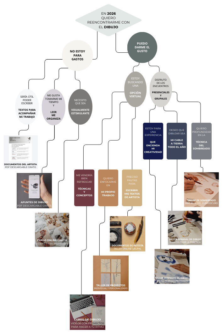 Este año logré organizar EL GESTO PROPIO para poder ofrecer distintos tipos de talleres y recursos orientados al dibujo y la creatividad. Armé un chart para que puedas enocontrar el taller, curso o documento descargable más útil para vos. Te dejo la imagen y en mi web podés encontrar una versión interactiva. VER CHART INTERCATIVO Si ya participaste de cualquiera de mis talleres, hiciste algún curso o descargaste documentos gratris de EL GESTO PROPIO que te fueron útiles, te invito a dejar tu...