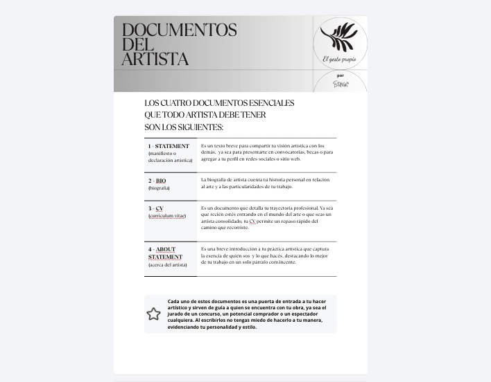 Preparé un nuevo PDF descargable gratis para compartirles. Se trata de los 4 documentos esenciales del artista, esos que piden en las inscripciones a concursos, becas y convocatorias y que también sirven para fortalecer nuestro perfil en redes sociales o para enviar a publicaciones: 1 - STATEMENT(manifiesto o declaración artística) 2 - BIO (biografía) 3 - CV (curriculum vitae) 4 - ABOUT STATEMENT (acerca del artista) El PDF consta de 5 paginas donde comento las características de cada...